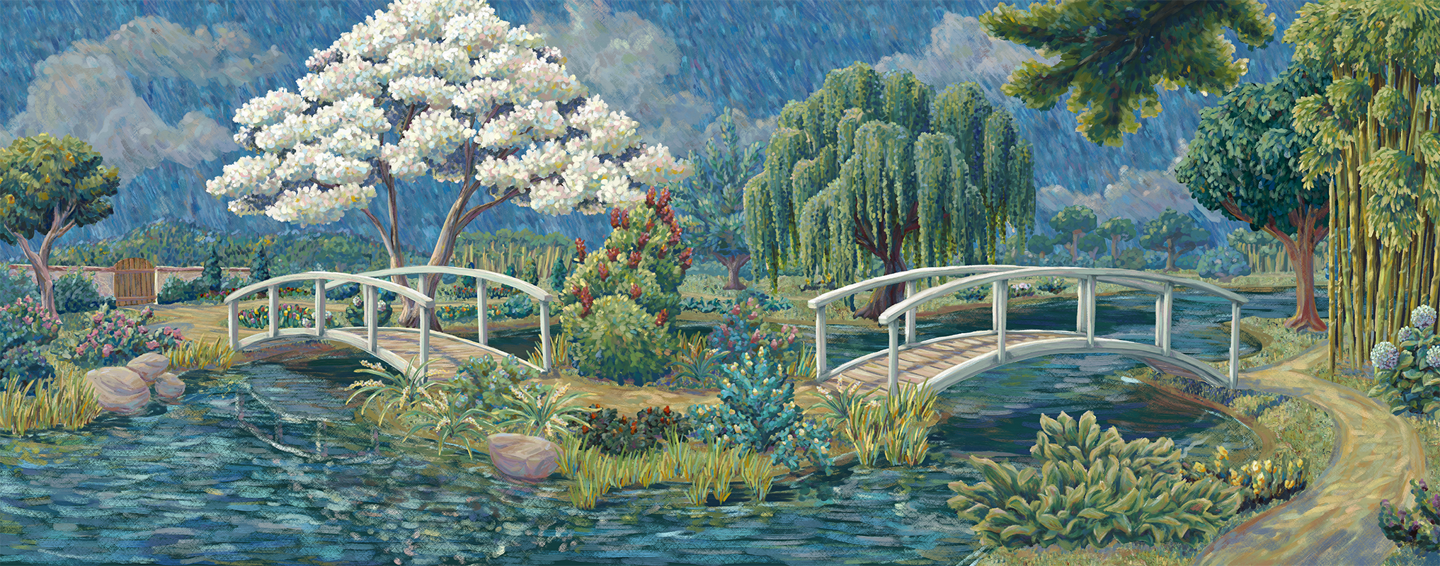 The project began for me with an extensive amount of research and practice. We wanted the wide Landscape Gallery to be basically an extension of the painting, so I began practicing imitating Frieseke’s style, trying to reproduce it digitally, while also looking intensively at photos and images from the real-life setting of the work, Frieseke’s home in Giverny. Mimicking his short rough strokes and bright colors, I created dozens of assets from backgrounds to buildings to flowers (so many flowers) which were then complied into a massive interactive scene.